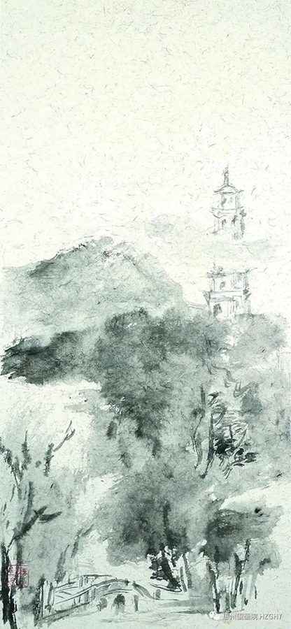 一是注重抽象與具象的結(jié)合。金旋的作品在繼承了傳統(tǒng)山水畫的基礎(chǔ)上,引入了一些抽象的元素和符號,使其既有具象的形象感,又有抽象的意象感,既有山水的實體,又有山水的精神。他的作品充滿了生機與活力,通過微妙的筆墨表現(xiàn)西湖的橋、塔、樓閣,這些元素交融,構(gòu)建出一幅幅雅致、淡泊而生動的作品。