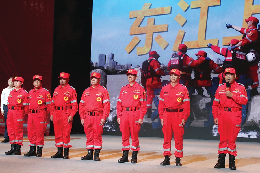 惠州市心連心公益協(xié)會(huì)黨支部書記、戰(zhàn)旗救撈隊(duì)隊(duì)長趙喜昌帶領(lǐng)團(tuán)隊(duì)上臺宣講;葜萑請(bào)記者鐘暢新 攝