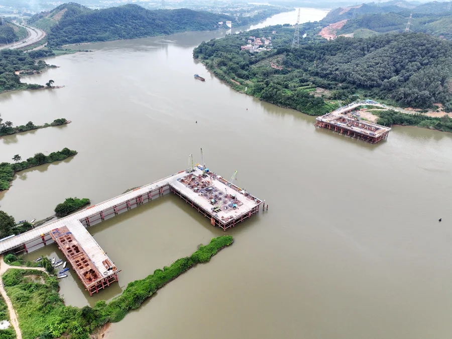 惠肇高速公路(惠城至增城段)控制性工程東江特大橋主墩樁基施工現(xiàn)場航拍;菡馗咚夙椖抗﹫D