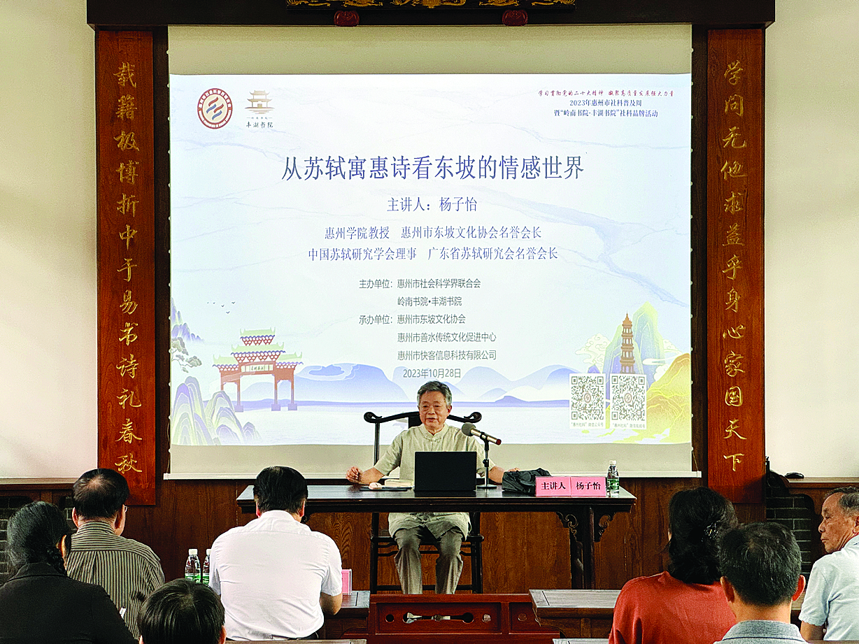 惠州日報(bào)訊 (記者侯縣軍 通訊員劉巧朋)10月28日,2023年惠州市社科普及周暨“嶺南書院·豐湖書院”品牌活動(dòng)——東坡文化專題講座在惠州豐湖書院樂群堂舉行,惠州學(xué)院原中文系教授、惠州市東坡文化協(xié)會(huì)名譽(yù)會(huì)長楊子怡主講《從蘇軾的寓惠詩看東坡的情感世界》,以詩論人,向聽眾還原一個(gè)真實(shí)的蘇東坡。