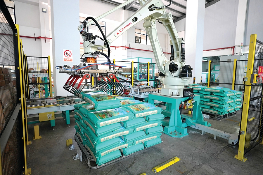 在博羅縣絲苗米省級(jí)現(xiàn)代農(nóng)業(yè)產(chǎn)業(yè)園內(nèi),現(xiàn)代化全自動(dòng)大米加工生產(chǎn)線上,大米瀑布般流出,接著被自動(dòng)打包裝袋,整個(gè)加工和包裝過程一氣呵成,省時(shí)省力。