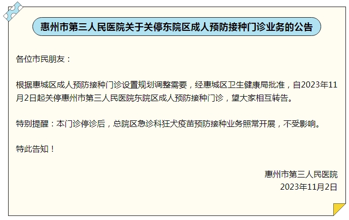 近日,惠州市第三人民醫(yī)院在微信公眾號發(fā)布公告,11月2日起,東院區(qū)成人預(yù)防接種門診業(yè)務(wù)關(guān)停。具體公告如下: