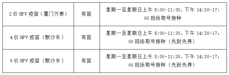 新一輪九價HPV疫苗已開放九價宮頸癌疫苗首針免預(yù)約接種(盧屋路接種點(diǎn)、人民六路接種點(diǎn)均有疫苗),無需預(yù)約,帶身份證即可接種。接種當(dāng)天工作時間均可在三樓自助取號。