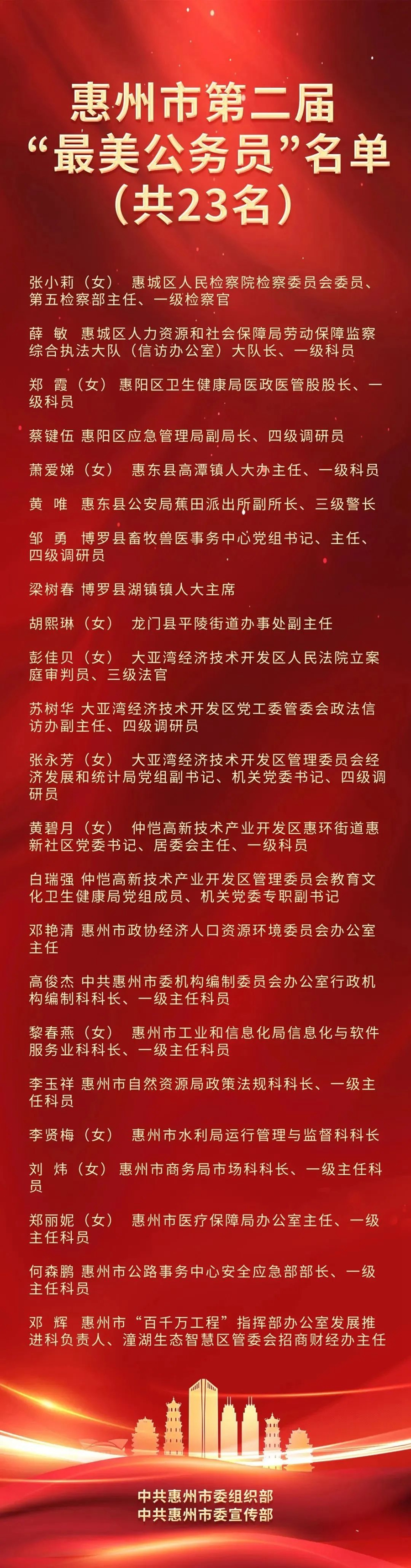 惠州日報訊 (記者歐陽成 香金群 通訊員惠市組)11月9日,市委組織部、市委宣傳部公布惠州市第二屆“最美公務(wù)員”和“最美公務(wù)員集體”評選結(jié)果,共23名個人、16個集體獲殊榮。