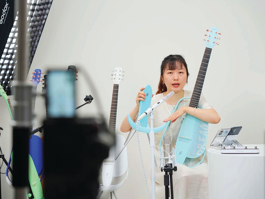 “刮風(fēng)這天,我試過(guò)握著你手,但偏偏,雨漸漸,大到我看你不見(jiàn)……”11月9日,在惠州市恩雅樂(lè)器有限公司直播間,一名女主播正撥動(dòng)琴弦,唱起了周杰倫的《晴天》。她告訴記者,這是公司最新款的智能電吉他,配了無(wú)線話筒,可以一邊彈一邊K歌。