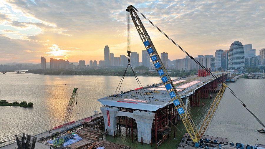 鵝城大橋由中鐵廣州局承建,橫跨東江,主橋采用四跨連續(xù)斜跨異型系桿拱橋。主橋鋼梁由拱跨鋼梁標(biāo)準(zhǔn)段、拱梁節(jié)點(diǎn)和梁跨鋼梁標(biāo)準(zhǔn)段3部分組成,本次架設(shè)的是合龍段鋼梁,梁長9.25米、頂寬45米、高3.5米、重269.4噸。為確保鋼梁架設(shè)順利,項(xiàng)目部多次召開會議,編制鋼梁架設(shè)專項(xiàng)方案,進(jìn)行安全技術(shù)交底。架梁過程中,技術(shù)人員全程盯控,目前47段鋼梁已全部架設(shè)完成。
