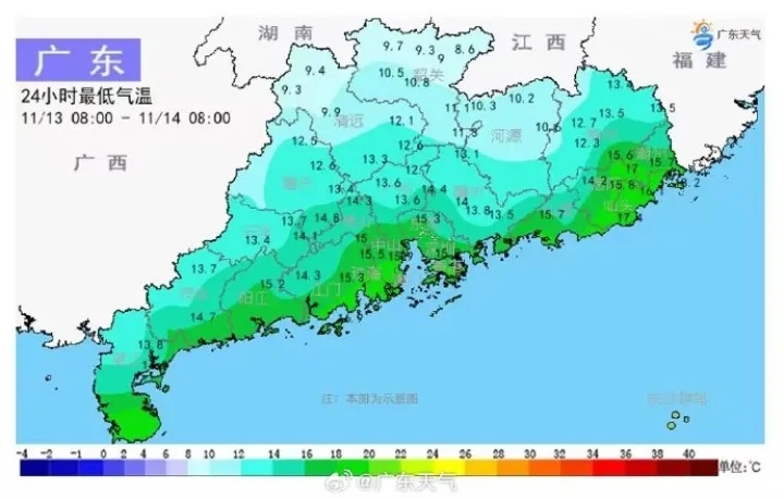 11月14日,受西路冷空氣補(bǔ)充影響,廣東迎今年下半年來最冷早晨,韶關(guān)、清遠(yuǎn)北部市縣最低氣溫跌破10℃,南雄低至8.6℃,廣州13.6℃,湛江14.3℃,深圳15.8℃,汕頭18℃。