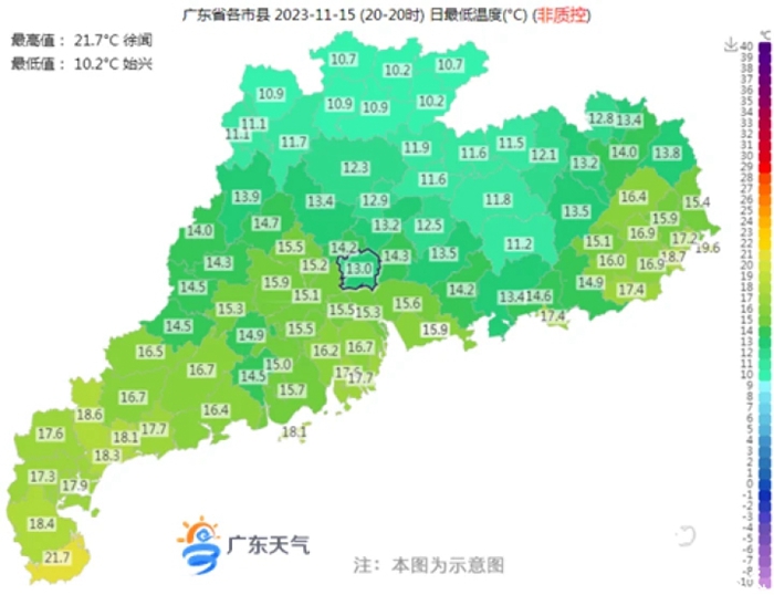 天氣實(shí)況:14日白天到15日早晨,韶關(guān)、清遠(yuǎn)、河源的北部出現(xiàn)了小到中雨。15日早晨最低氣溫分布:韶關(guān)、清遠(yuǎn)北部和河源10~12℃,南部市縣15~18℃,其余13~15℃,其中韶關(guān)仁化錄得全省最低氣溫10.2℃。