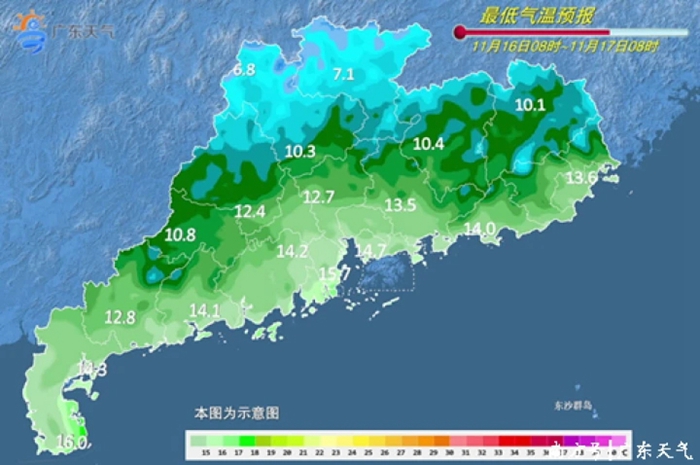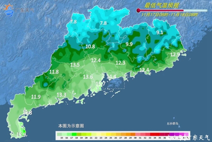 16-17日,受中等強(qiáng)度冷空氣影響,粵北和珠江三角洲北部市縣零星小雨轉(zhuǎn)多云,我省大部市縣將出現(xiàn)5~7級(jí)陣風(fēng),各地平均氣溫下降4~6℃,最低氣溫將出現(xiàn)在18日早晨,其中,粵北偏北的高海拔山區(qū)有低于5℃的低溫,17-18日,天晴干燥,晝夜溫差大;15-17日,我省海面持續(xù)有6~8級(jí)的東北大風(fēng)。