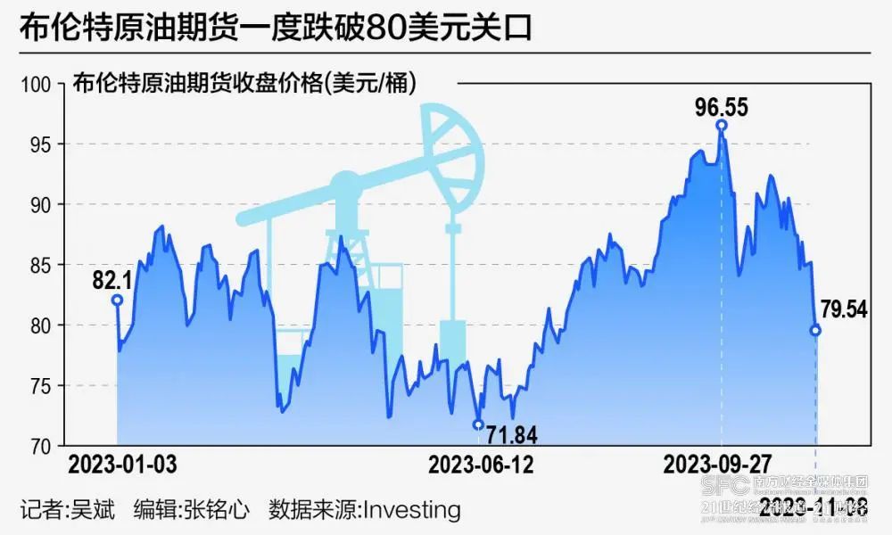 11月10日,布倫特原油期貨徘徊在80美元/桶附近,WTI原油期貨在76美元/桶附近。