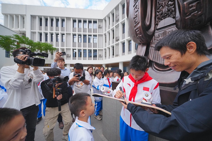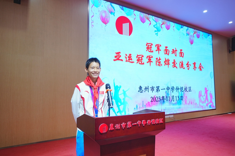 11月13日下午,惠州一中仲愷校區(qū),年僅15歲的杭州亞運會滑板男子碗池冠軍陳燁,和父親陳玩欽一同來到校園出席面對面交流活動。作為最年輕的亞運金牌得主,陳燁的到來引來了師生們的陣陣歡呼。