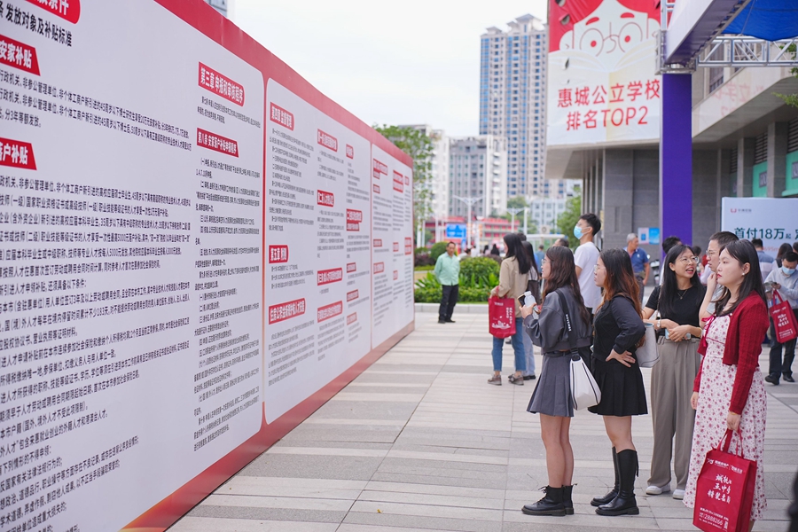 “新引進(jìn)人才最高可享受30萬元安家補(bǔ)貼”“公積金最高貸款額度提高至單人100萬元、夫妻雙方150萬元”“在市級相關(guān)補(bǔ)助的基礎(chǔ)上,還可額外享受2~10萬元區(qū)級安家補(bǔ)助”……一條條惠州最新的人才安居政策細(xì)則詳細(xì)羅列在展板上,吸引了眾多參與活動的嘉賓圍觀閱覽。