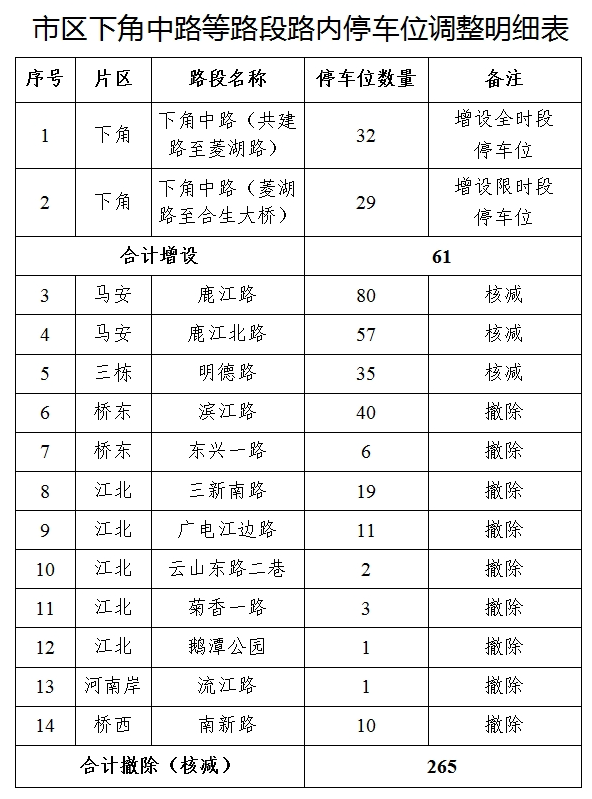 其中,規(guī)范設(shè)置下角片區(qū)下角中路等2條路段61個(gè)停車位,下角中路共建路至菱湖路段增設(shè)32個(gè)全時(shí)段停車位,下角中路菱湖路至合生大橋段增設(shè)限時(shí)停車位29個(gè);撤除(核減)馬安片區(qū)鹿江路等12條路段所設(shè)265個(gè)停車位。馬安鹿江路、鹿江北路核減137個(gè)停車位,三棟明德路核減35個(gè)停車位,橋東濱江路、東興一路撤除46個(gè)停車位,江北三新南路、廣電江邊路、菊香一路、鵝潭公園撤除34個(gè)停車位,河南岸流江路撤除1個(gè)停車位,橋西南新路撤除10個(gè)停車位。