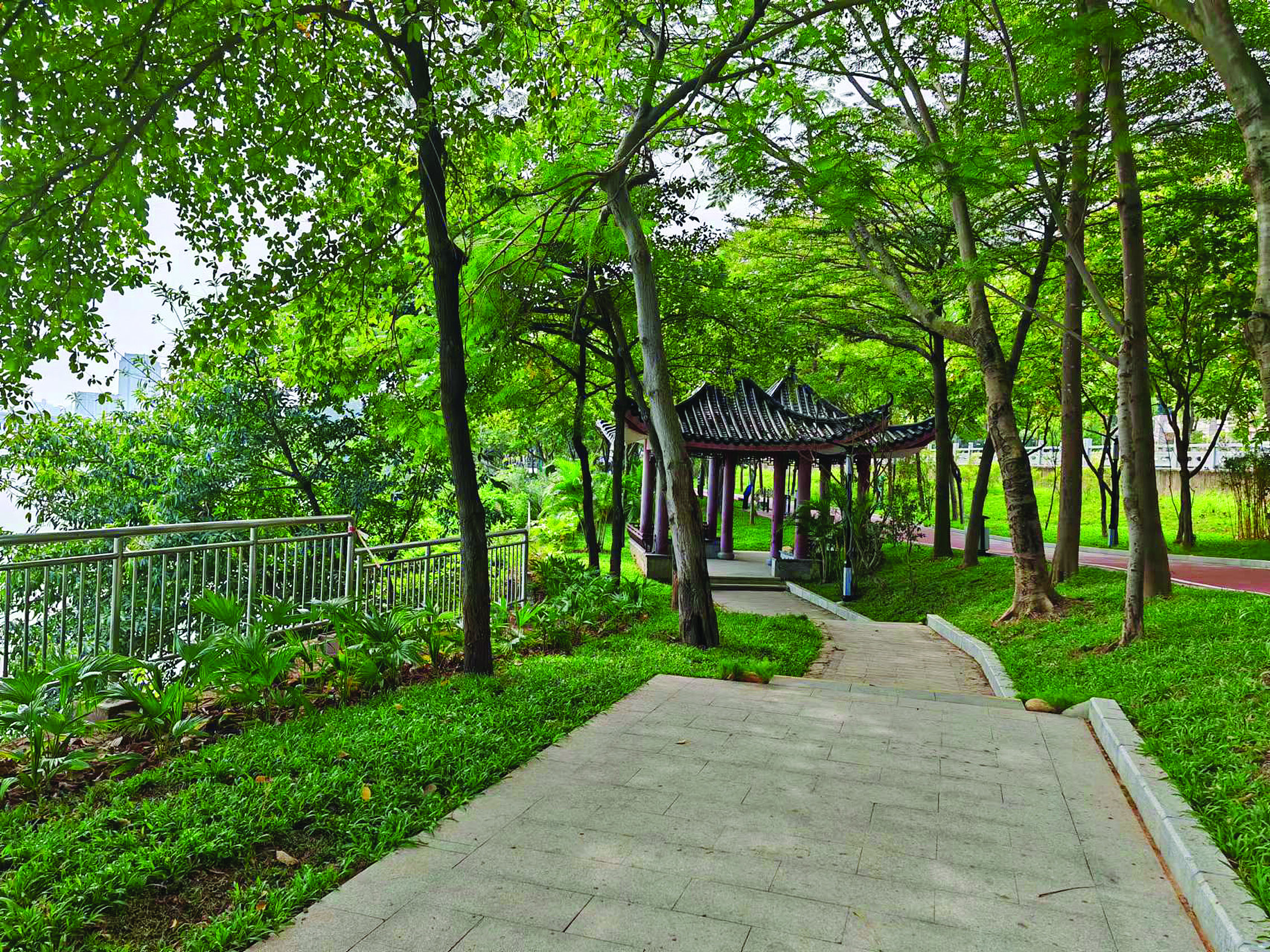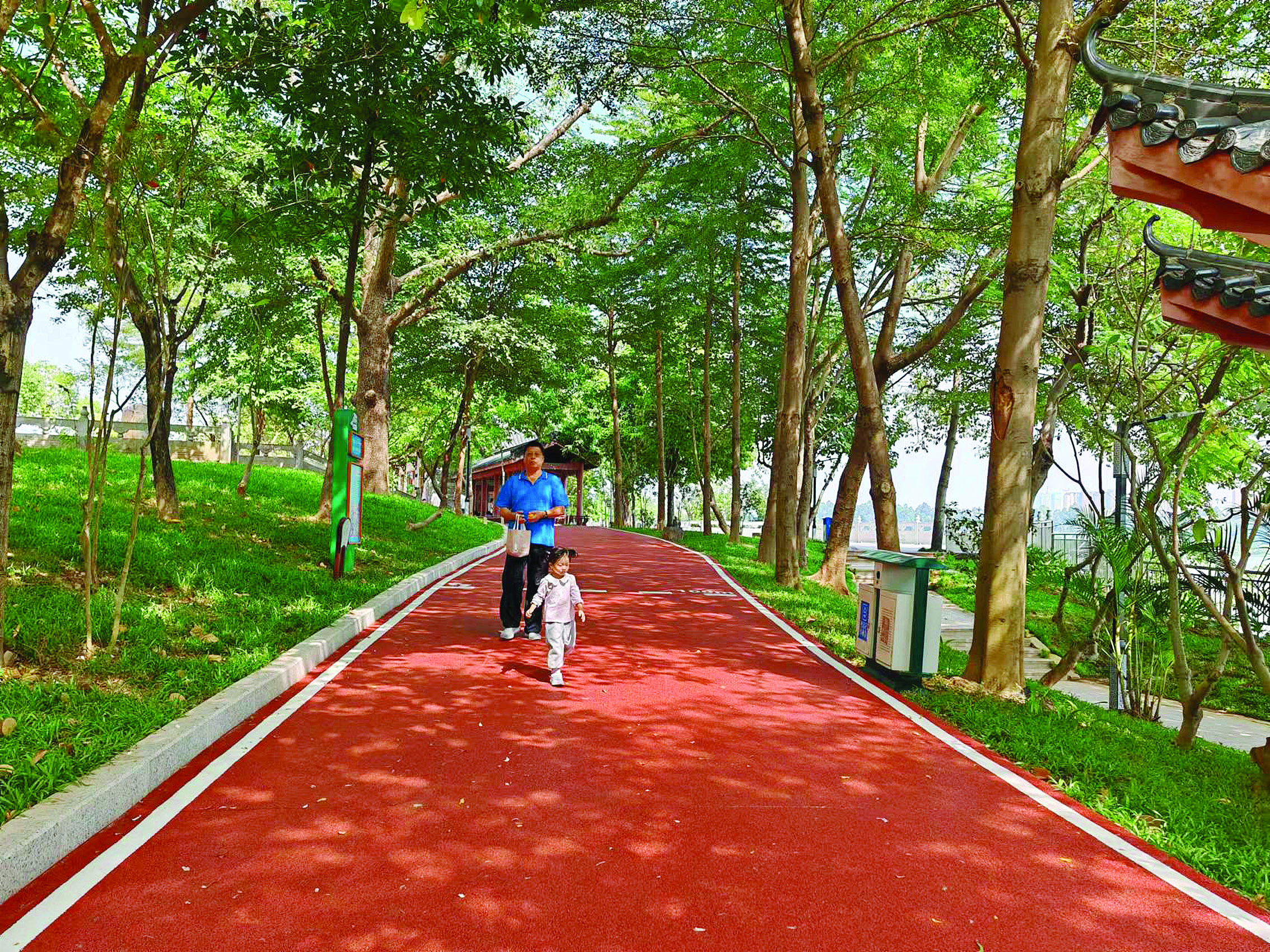改造提升工程內(nèi)容還包括新增園路汀步,翻新彩色透水混凝土路面,修繕景觀平臺鋪裝,完善給水排水系統(tǒng),其中翻新紅色透水混凝土步道長約700米、寬3.2米。