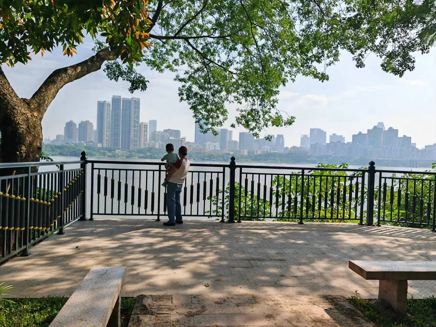 公園沿江一側(cè)新增了600多米的防護欄,給人帶來滿滿的安全感!把亟钠旅孑^陡,增加防護欄能更好地保障游園市民的安全!敝芎Q嗾f,此次改造還設(shè)置了非機動車停放點4個、停車位106個等,嚴禁非機動車穿行入園,提高安全性。