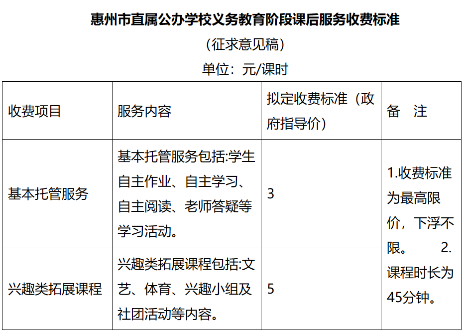 義務(wù)教育階段課后服務(wù)收費(fèi)標(biāo)準(zhǔn)意見的公告》