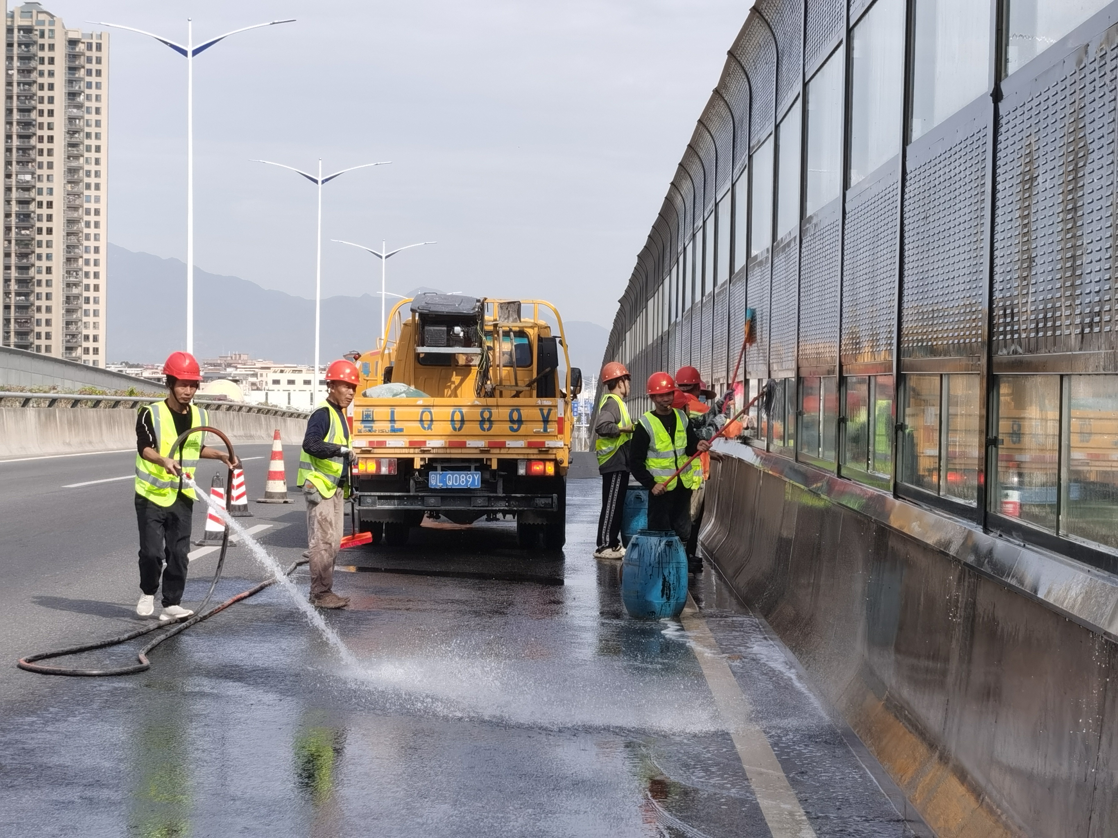 據(jù)介紹,在市市政園林事務(wù)中心統(tǒng)籌安排下,目前已完成三環(huán)立交橋、云山東路及新湖一路下穿通道一側(cè)擋墻及隔音屏的清洗工作,并于11月18日開始對金龍大道市區(qū)路段的下沉通道、跨線橋隔音屏開展清洗,每天投入兩臺灑水車及兩輛工程車,并出動20人次,計劃11月27日前完成全部清洗任務(wù)。