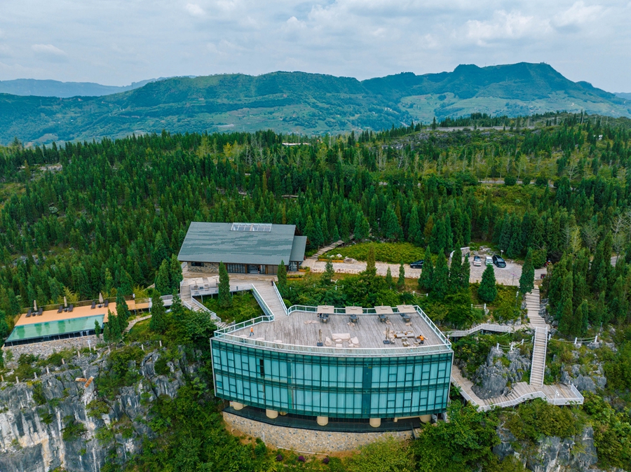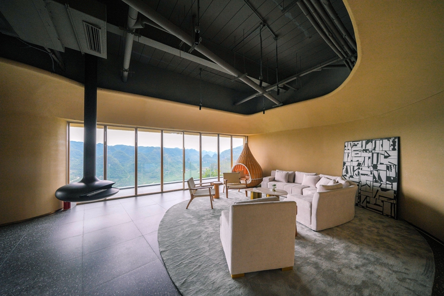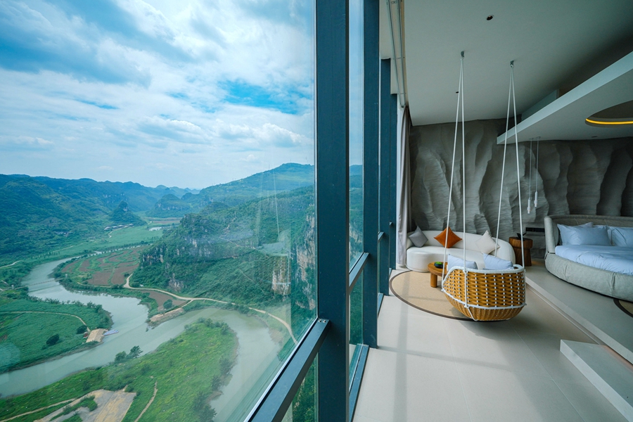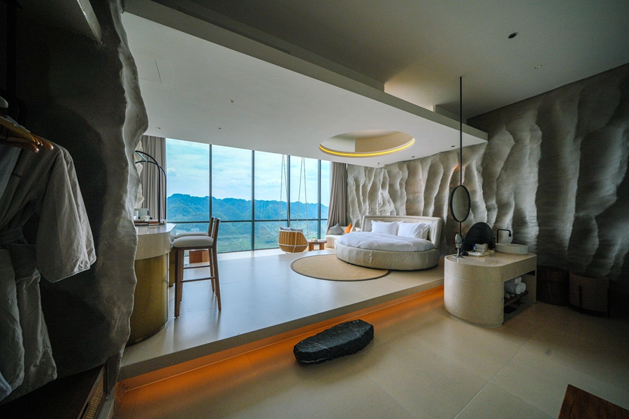 為解決“如何讓游客留得下來”的問題,安龍縣世紀(jì)投資文旅發(fā)展有限公司首先將溶巖美術(shù)館改造成為獨(dú)具特色的懸崖酒店。該公司執(zhí)行董事吳斌介紹,美術(shù)館的內(nèi)部被改造成11間客房+一個公共活動空間,房間以溶巖秘境風(fēng)格裝修,走進(jìn)去仿佛穿越到史前。透過房間的落地窗,眺望峰林、峭壁、山谷、河流等喀斯特地貌景觀,更可感受與自然融為一體的喜悅與神奇。酒店屋頂被打造為觀景臺,一旁還配了無邊際泳池,徜徉其中,看云卷云舒,觀浩瀚星空,自在山水間。