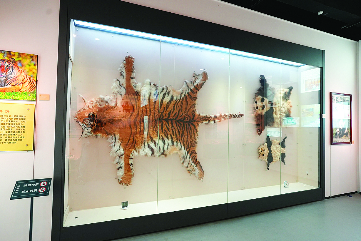 緝私動物皮系列展區(qū)中的老虎皮與熊貓皮。