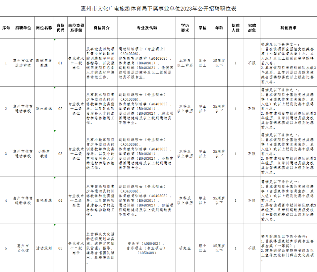 惠州市體育運(yùn)動(dòng)學(xué)校、惠州市文化館計(jì)劃招聘事業(yè)編制工作人員共5名。具體招聘崗位、人數(shù)和資格條件詳見附件1。
