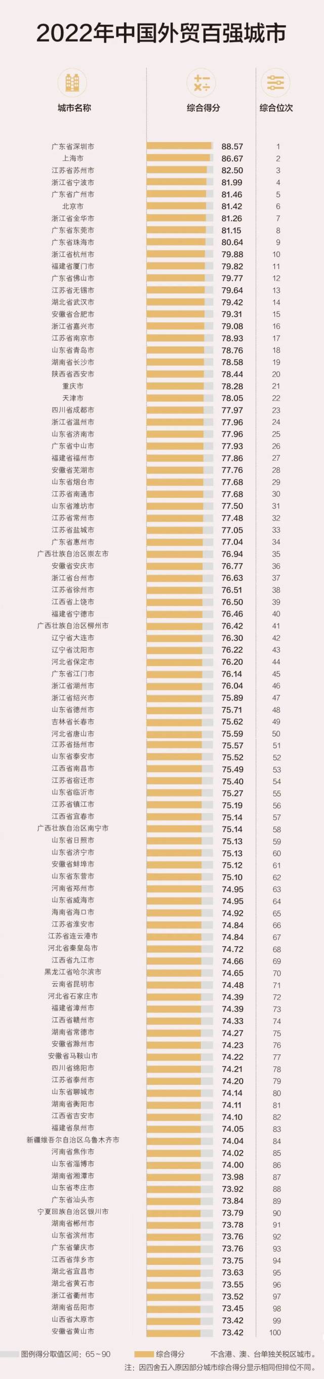 外貿(mào)綜合競(jìng)爭(zhēng)力百?gòu)?qiáng)城市中,東部地區(qū)依然大幅領(lǐng)先,2022年有60座城市入圍,較2021年增加1座,其中廣東深圳、上海、江蘇蘇州連續(xù)2年穩(wěn)居前三位,且東部城市包攬前10強(qiáng),領(lǐng)先優(yōu)勢(shì)穩(wěn)固。中部地區(qū)有26座城市入圍,較2021年增加3座,其中排位最高的湖北武漢居第14位,提升3個(gè)位次。西部地區(qū)和東北地區(qū)分別有10座和4座城市入圍,較2021年均減少2座,排位最高的分別為第20位的陜西西安、第42位的遼寧大連。