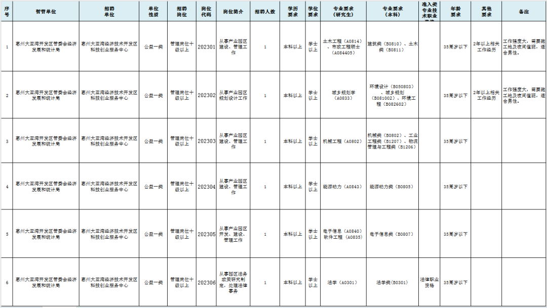 本次公開(kāi)招聘的事業(yè)單位為大亞灣開(kāi)發(fā)區(qū)科技創(chuàng)業(yè)服務(wù)中心,共6個(gè)崗位。(具體招聘啟事請(qǐng)登錄惠州大亞灣開(kāi)發(fā)區(qū)官網(wǎng)查看)