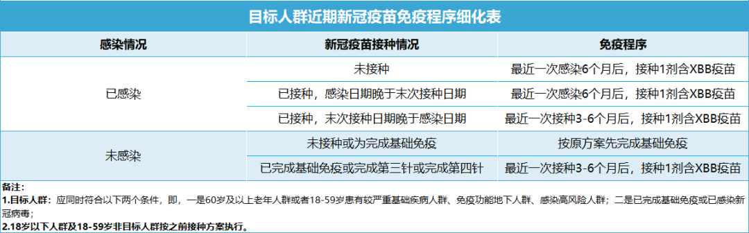 1、目標(biāo)人群在最近一劑接種3個(gè)月后或最近一次感染6個(gè)月后(兩種情況均發(fā)生的,以時(shí)間最近的一次為準(zhǔn)),可接種1劑次含XBB變異株抗原成分的疫苗。