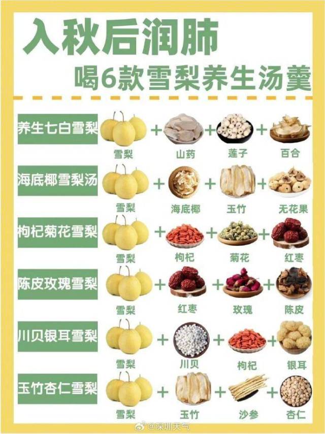 自從入秋以后,秋燥逐漸明顯,往往會造成皮膚干,嗓子干,容易上火。@深圳天氣同學(xué),給大家?guī)黻P(guān)于雪梨的六種養(yǎng)生湯、養(yǎng)生茶的常見搭配。大家記得收藏起來煲點靚湯,煮點靚茶, 嘆下“秋”先啦!