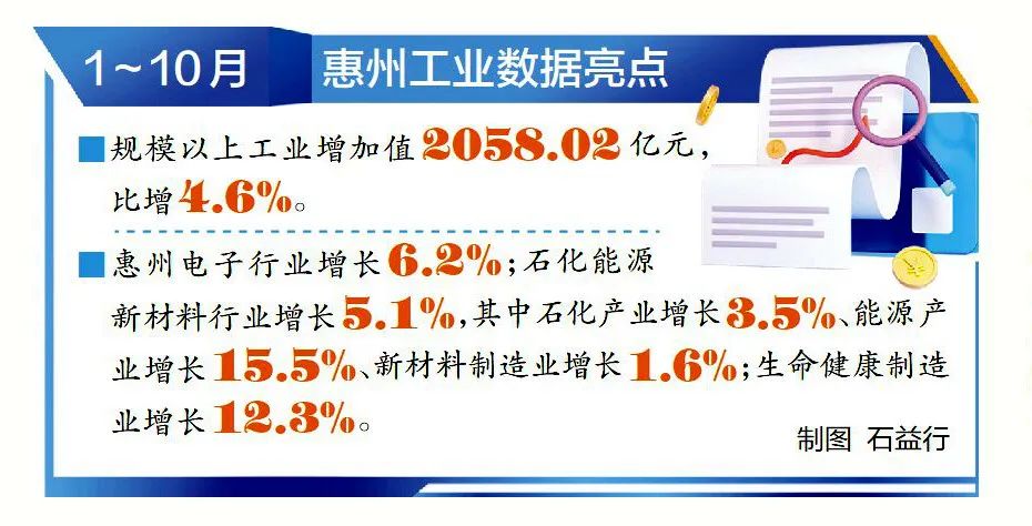 這當(dāng)中,“2+1”現(xiàn)代產(chǎn)業(yè)起到了重要的支撐作用。統(tǒng)計數(shù)據(jù)顯示,1~10月,惠州電子行業(yè)增長6.2%;石化能源新材料行業(yè)增長5.1%,其中石化產(chǎn)業(yè)增長3.5%、能源產(chǎn)業(yè)增長15.5%、新材料制造業(yè)增長1.6%;生命健康制造業(yè)增長12.3%。