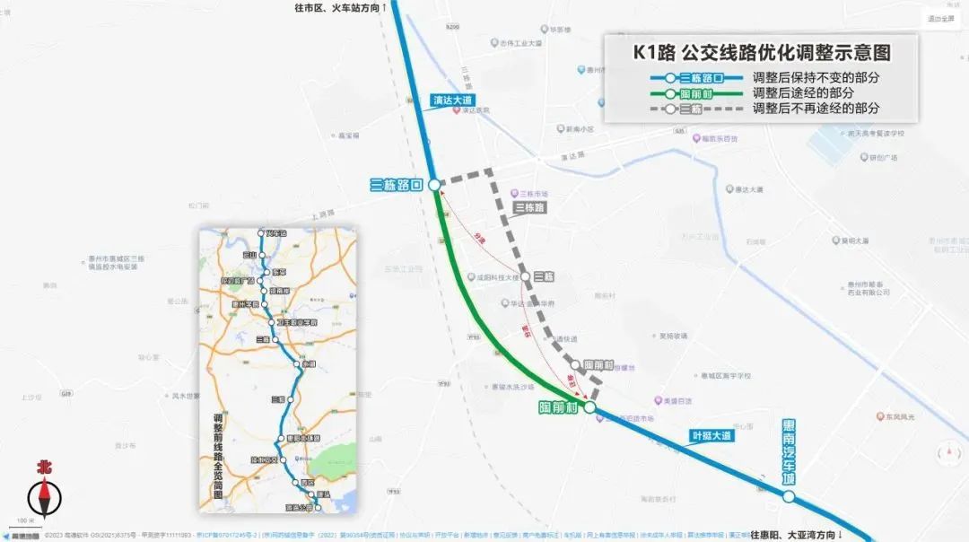 線路增設(shè)站點(diǎn):線路改由演達(dá)大道直行葉挺大道行駛,原三棟路口、陶前村站點(diǎn)遷移至葉挺大道?。