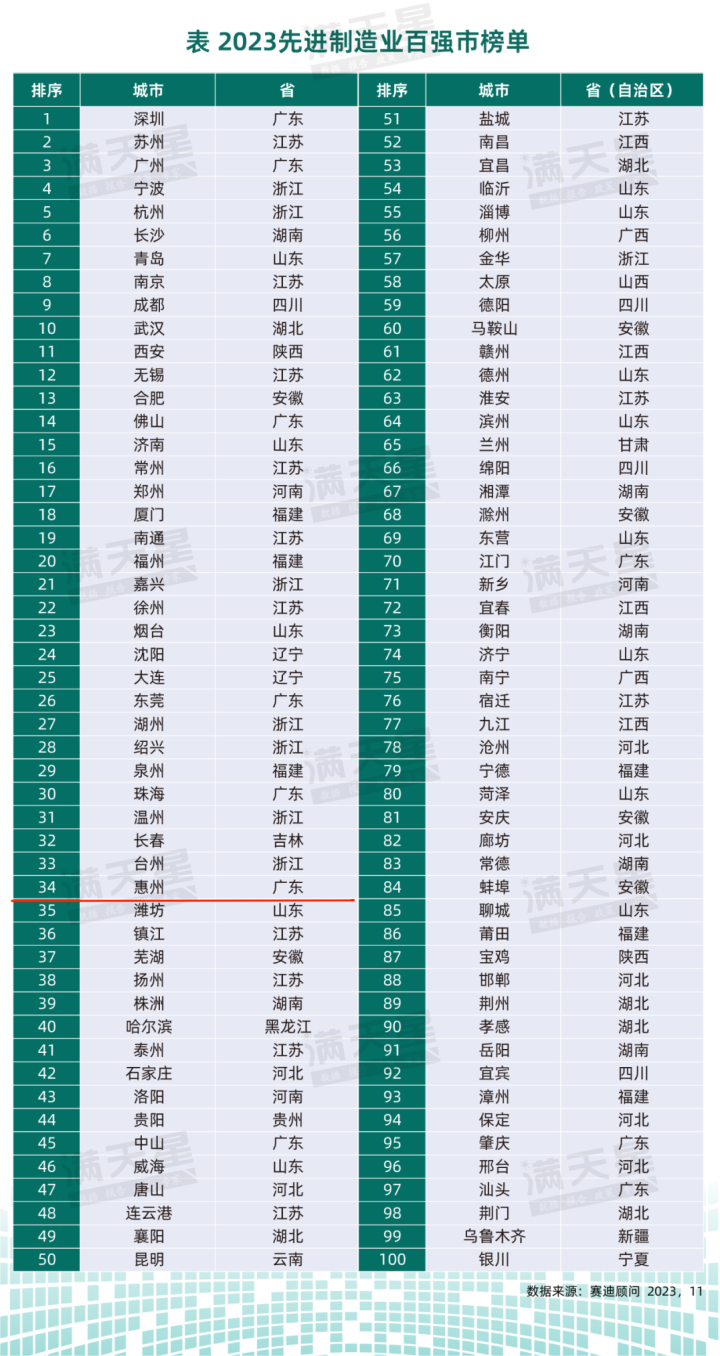 11月24日,在2023先進(jìn)制造業(yè)發(fā)展大會上,工業(yè)和信息化部中國電子信息產(chǎn)業(yè)發(fā)展研究院下屬的賽迪顧問發(fā)布了《2023先進(jìn)制造業(yè)城市研究報告》,公布2023先進(jìn)制造業(yè)百強(qiáng)市榜單,惠州上榜2023先進(jìn)制造業(yè)百強(qiáng)市,排名全國第34位。