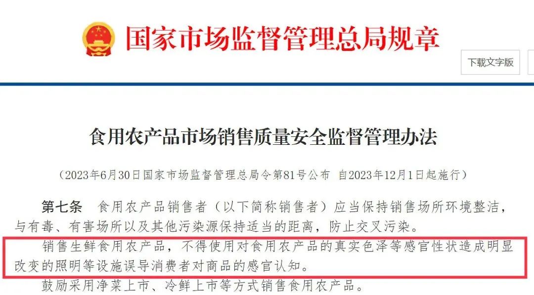 對于群眾反映“生鮮燈”誤導消費者問題,國家市場監(jiān)管總局7月22日發(fā)布的《食用農產品市場銷售質量安全監(jiān)督管理辦法》(以下簡稱“《辦法》”)有了明確的規(guī)定:“銷售生鮮食用農產品,不得使用對食用農產品的真實色澤等感官性狀造成明顯改變的照明等設施誤導消費者對商品的感官認知。”《辦法》將于今年12月1日起施行。