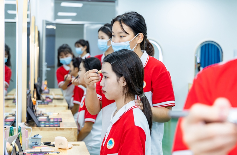 美容美發(fā)專業(yè)學(xué)生互為模特進(jìn)行練習(xí)。