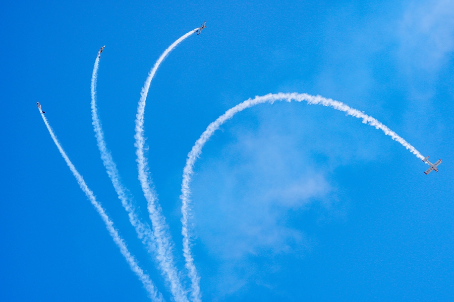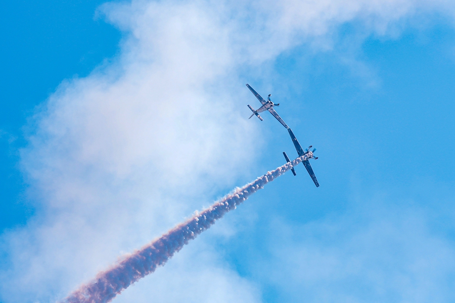 帶來(lái)飛行表演揭幕大戲的是來(lái)自歐洲的“穿越騎士”飛行表演隊(duì),這也是其來(lái)華“首秀”。該飛行隊(duì)成立于2019年,由英法兩國(guó)飛行員組成,是世界各大航展的?。記者在現(xiàn)場(chǎng)看到,“穿越騎士”駕駛的四架EXTRA300飛機(jī)呈菱形編隊(duì)升空,在發(fā)動(dòng)機(jī)的咆哮聲中,四條白色煙帶在空中拉出一圈圈“絲帶”……隨后,“騎士們”帶來(lái)了四機(jī)編隊(duì)的失速倒轉(zhuǎn)、蝴蝶筋斗、鏡像飛行、雙機(jī)對(duì)沖等經(jīng)典動(dòng)作。其中,“落葉飄”這一表演贏得觀眾陣陣歡呼,只見950公斤的EXTRA300飛機(jī)如落葉一般飄在空中,炫酷且驚心動(dòng)魄。表演接近尾聲時(shí),四架飛機(jī)分成兩組,在空中“畫”下兩顆愛(ài)心,把獨(dú)有的浪漫獻(xiàn)給熱情的觀眾。