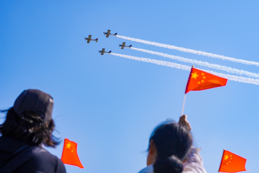 碧空之下國(guó)旗招展,原來(lái)是湖南山河飛行表演隊(duì)正在為觀眾表演高難度“鳳尾”展開和分層交叉開花等“定制”飛行動(dòng)作。據(jù)了解,山河飛行表演隊(duì)隸屬于湖南山河通航有限公司,正式成立于2014年,是國(guó)內(nèi)第一支運(yùn)動(dòng)飛機(jī)表演隊(duì),也是第一支純國(guó)產(chǎn)的民間飛行表演隊(duì)。4架表演機(jī)均為山河自主研發(fā)生產(chǎn)的阿若拉SA60L單發(fā)雙座前三點(diǎn)式起落架飛機(jī),這是我國(guó)首個(gè)取得中國(guó)民航局適航認(rèn)證的民族自主品牌輕型運(yùn)動(dòng)飛機(jī)。以藍(lán)天為畫布,他們精湛的飛行技藝,讓觀眾目不暇接。