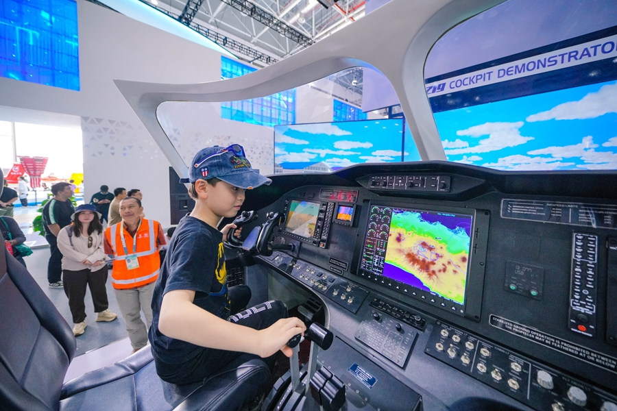 小朋友在印尼航空客貨運(yùn)輸?shù)腘219飛機(jī)模擬器上體驗(yàn)飛行。