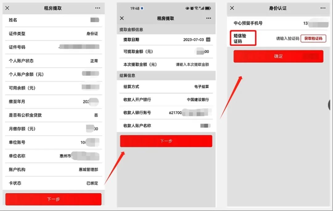 ②確認個人公積金賬戶信息并點擊【下一步】按鈕;填寫本次提取金額(不能大于系統(tǒng)計算出來的可提取金額),確認收款銀行賬戶信息并點擊【下一步】按鈕;在身份認證頁面,點擊【獲取驗證碼】按鈕并輸入收到的短信驗證碼,最后點擊【確定】按鈕。
