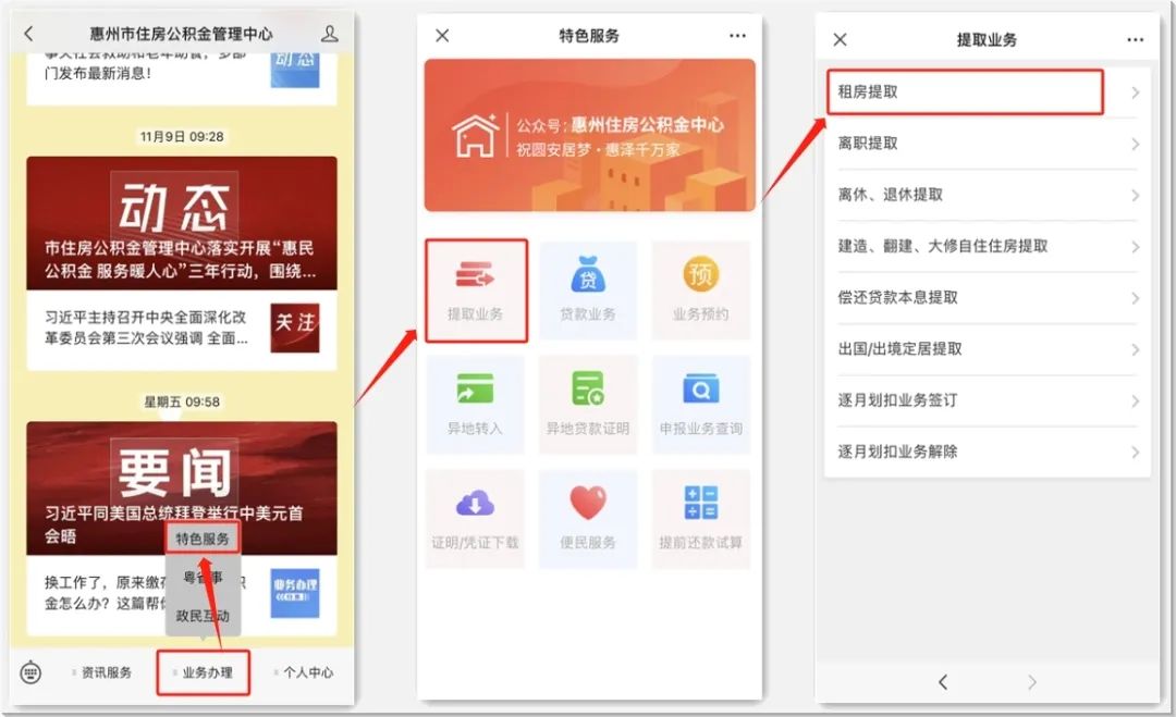 ①在“惠州市住房公積金管理中心公眾號”首頁,依次點擊【業(yè)務辦理】-【特色服務】-【提取業(yè)務】-【租房提取】,進入租房提取頁面: