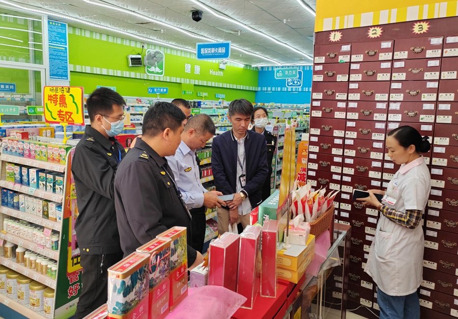 惠州市市場(chǎng)監(jiān)督管理局與惠城區(qū)市場(chǎng)監(jiān)督管理局執(zhí)法人員對(duì)藥店開展專項(xiàng)檢查。東江圖片社供圖