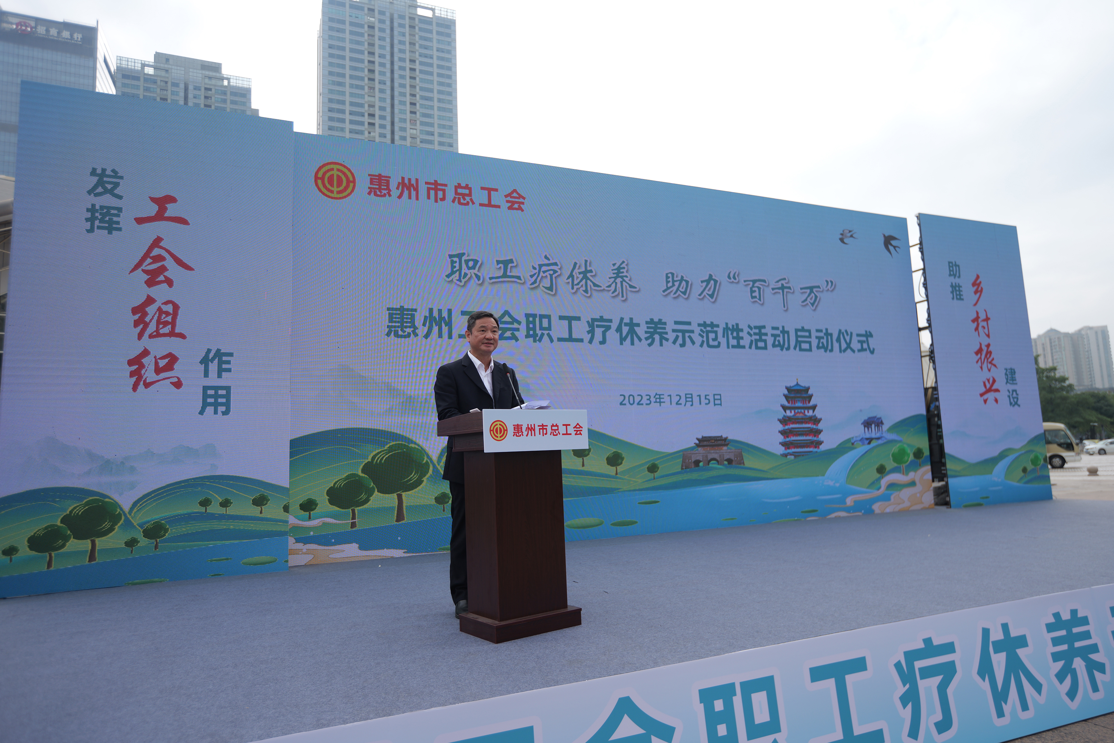 惠州工會(huì)職工鄉(xiāng)村療休養(yǎng)示范性活動(dòng)啟動(dòng)儀式現(xiàn)場(chǎng)。