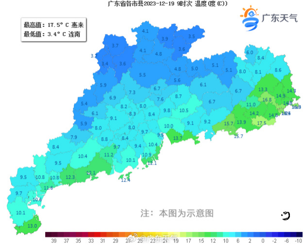 19日9時(shí),全省最低氣溫的連南只有3.4℃