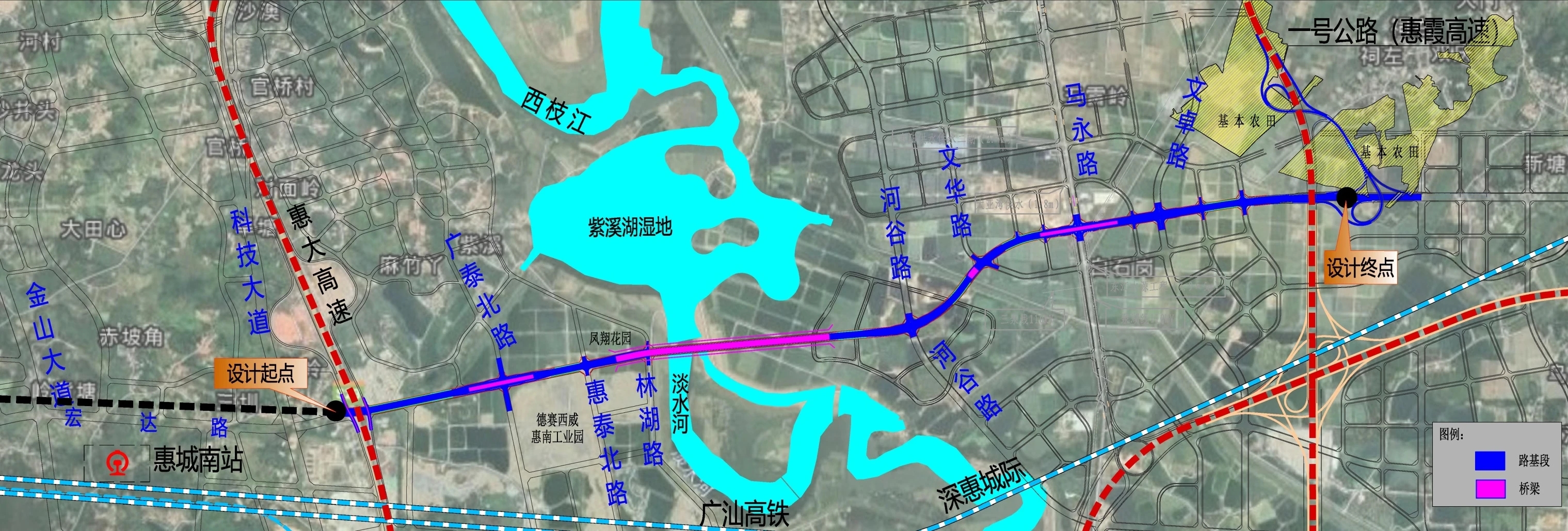 宏達路(惠大高速至一號公路段)工程(一期)起于惠大高速西側(cè),先后下穿惠大高速、廣泰北路,終于規(guī)劃林湖路,路線全長約1.77公里,采用城市主干路標(biāo)準(zhǔn),雙向8車道,設(shè)計時速60公里,計劃2025年底完工。