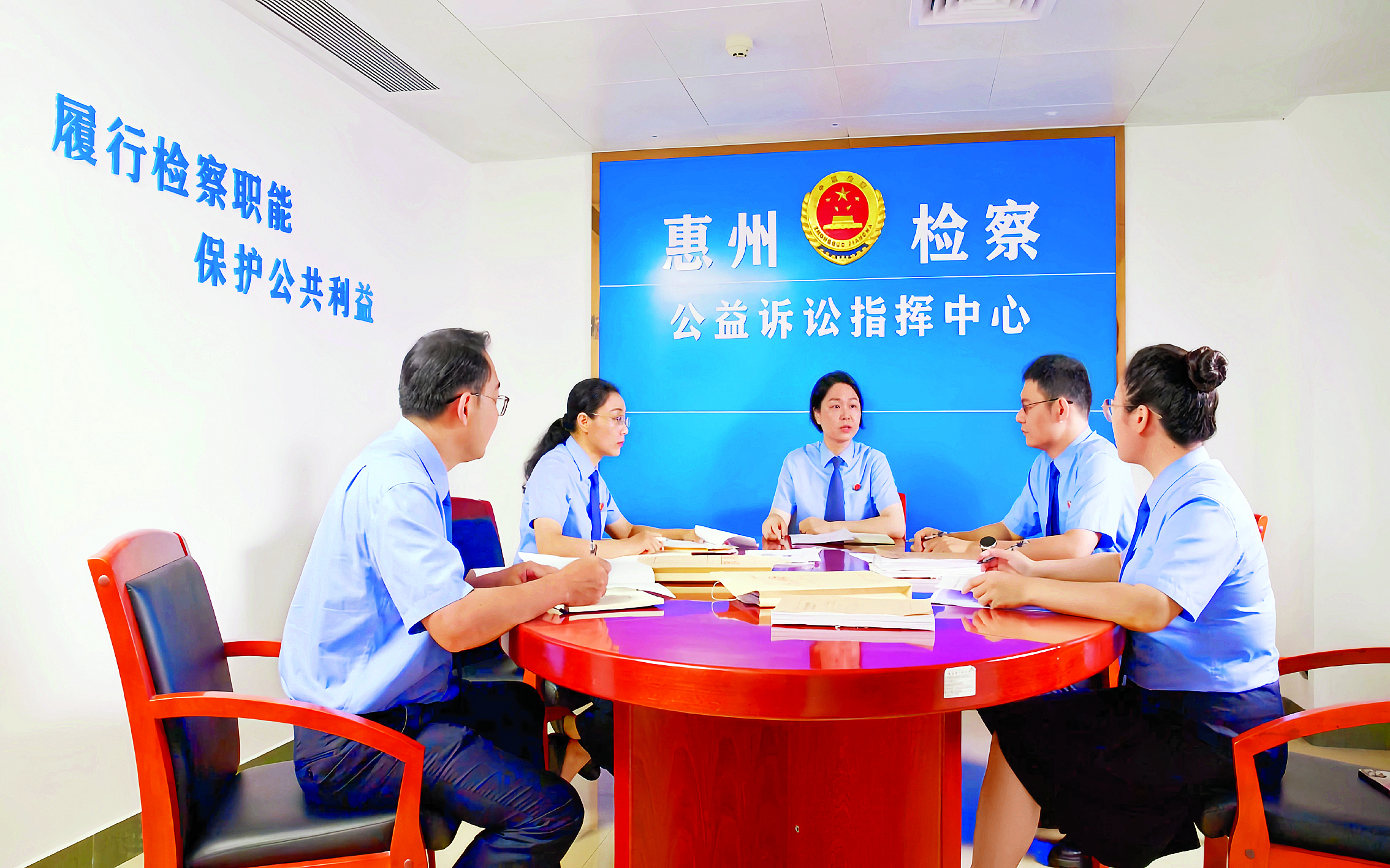 惠州市人民檢察院公益訴訟辦案團(tuán)隊(duì)在開展案件討論。