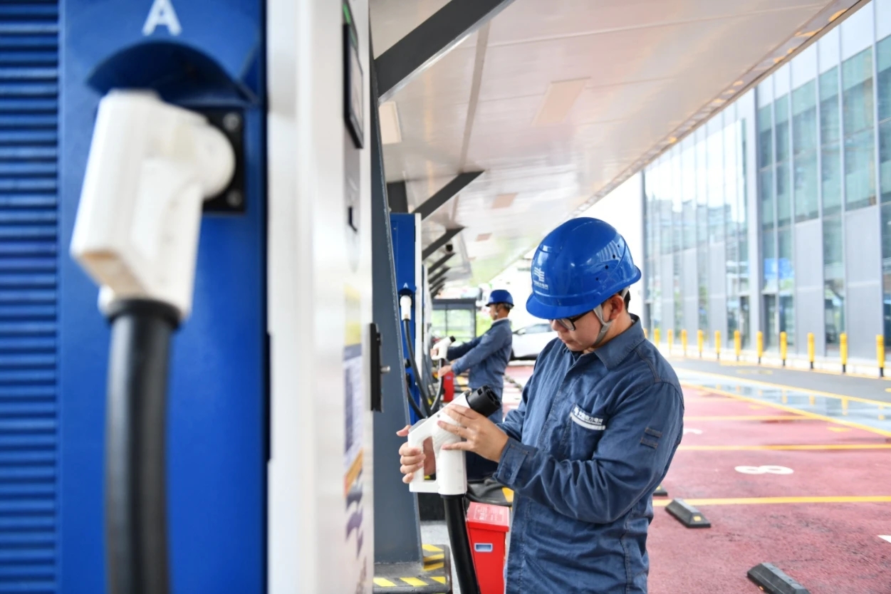 惠州惠城供電局運(yùn)維人員正在對(duì)望江綜合能源充電站進(jìn)行安全檢查 陳凌攝