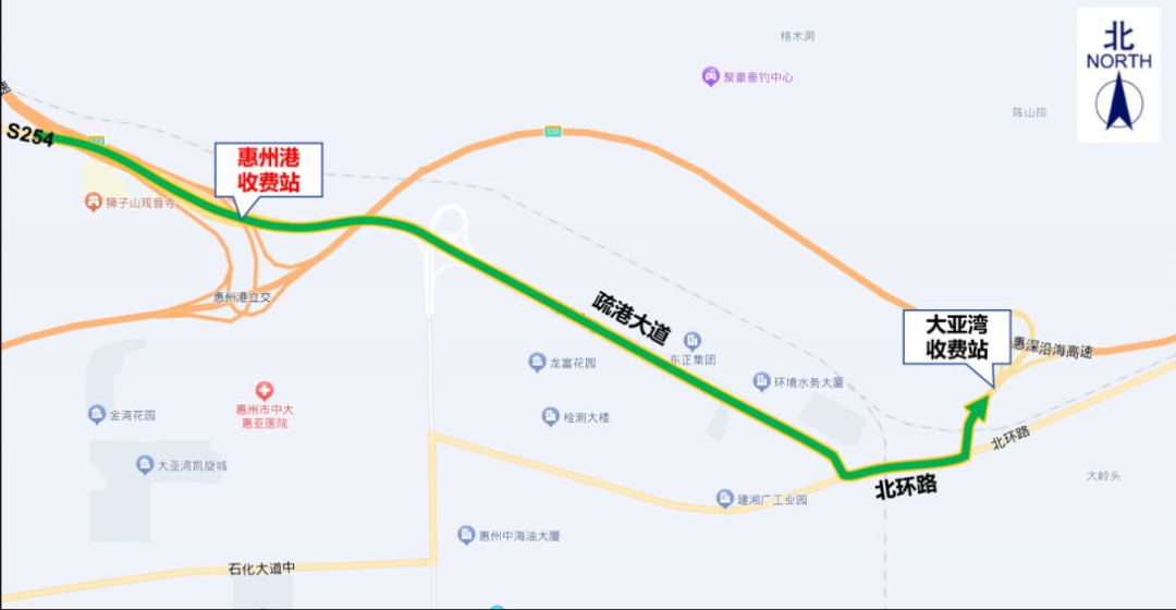 1.惠州港收費站:交通管制時間內,原計劃從惠州港收費站上高速的貨車,可通過疏港大道→北環(huán)路→惠深沿海高速大亞灣收費站上高速。