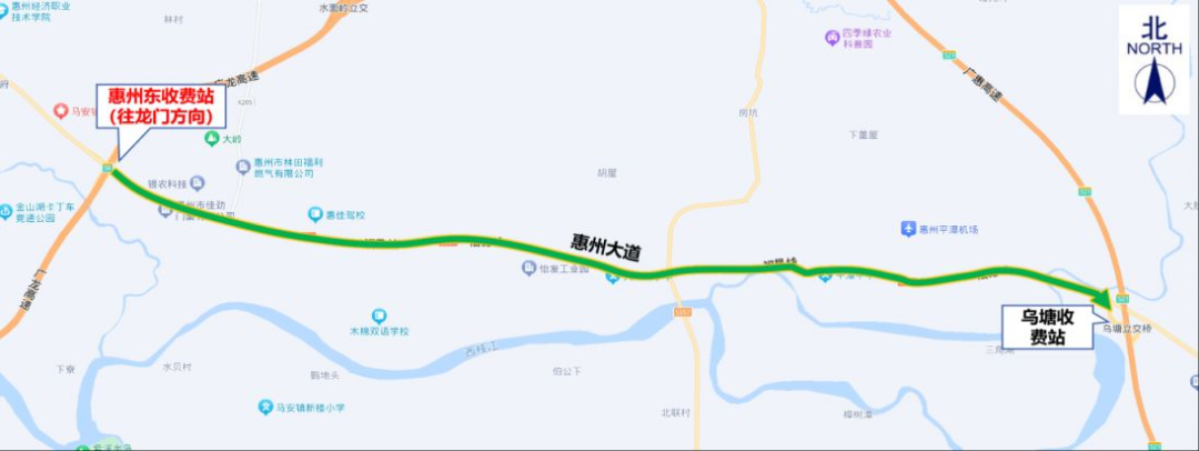 3.惠州東收費站(往龍門方向):交通管制時間內,原計劃從惠州東收費站入口上高速往龍門方向的貨車,可通過惠州大道→烏塘收費站上高速。