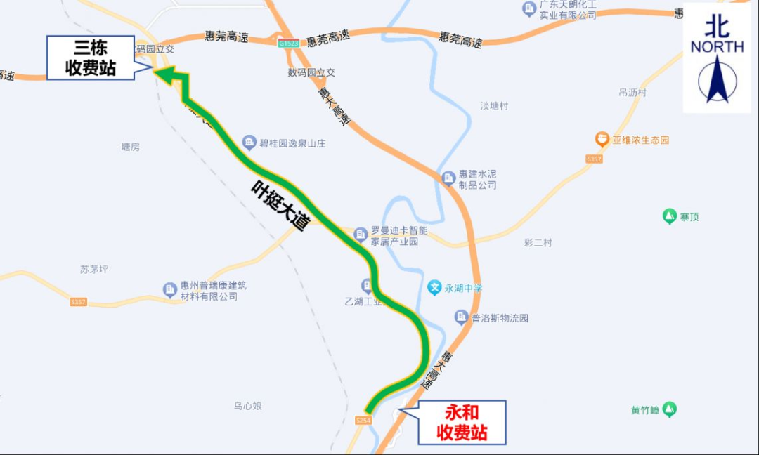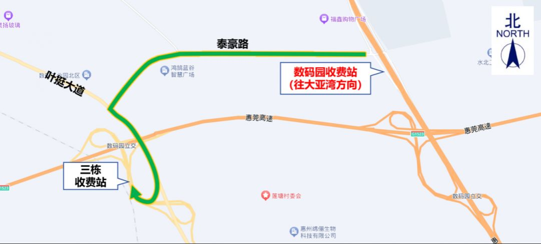 3.數(shù)碼園收費站(往大亞灣方向):交通管制時間內,原計劃從數(shù)碼園收費站上高速往大亞灣方向的貨車,可通過泰豪路→葉挺大道→三棟收費站上高速。