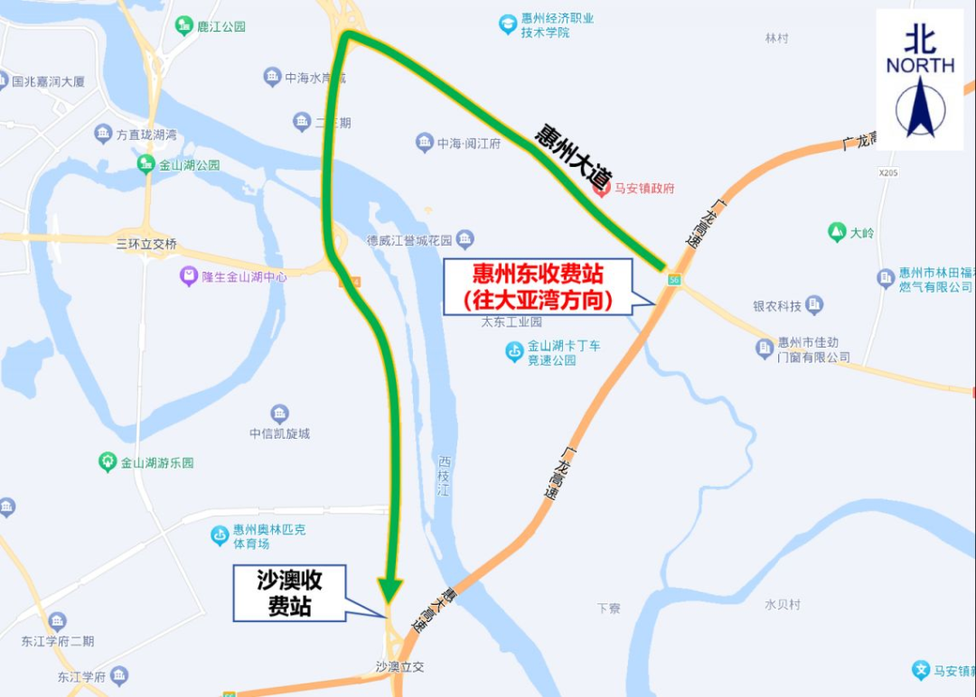 4.沙澳收費站:交通管制時間內,原計劃從沙澳收費站入口上高速往大亞灣方向的貨車,可通過惠州大道→惠州東收費站(往大亞灣方向)上高速。