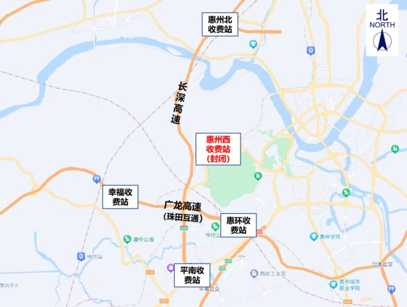長深高速往返惠州的車輛,請選擇就近的惠州北收費站或平南收費站上下高速;或經(jīng)珠田互通轉廣龍高速,從幸福收費站或惠環(huán)收費站上下高速。