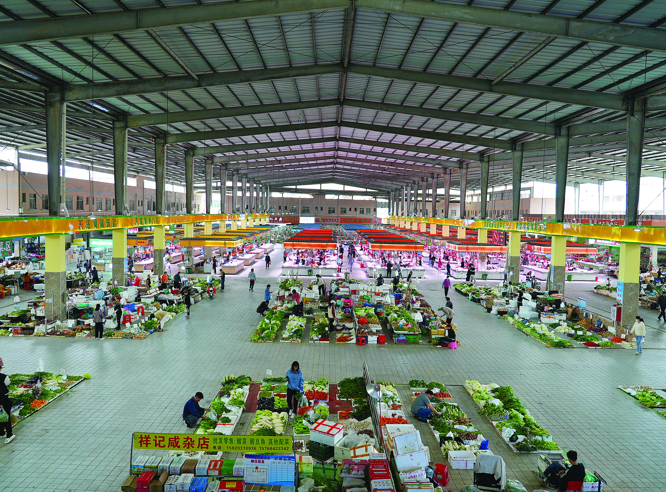 近日,記者在現場看到,改造后的湖山農貿批發(fā)市場寬敞明亮,區(qū)域劃分清晰,包括糧油副食品區(qū)、蔬菜區(qū)、水果區(qū)、肉類區(qū)、豆制品區(qū)、熟食區(qū)、三鳥區(qū)、水產區(qū)、雜貨區(qū)等經營區(qū)域。市場還專門劃出自產自銷點,設40個攤位供附近農民售賣自家種的蔬菜。市場內的主通道有5米寬,區(qū)域之間的通道也有2~3米寬,每兩個檔口之間還放置了垃圾桶,保潔員流動清掃,整個市場干凈清爽。